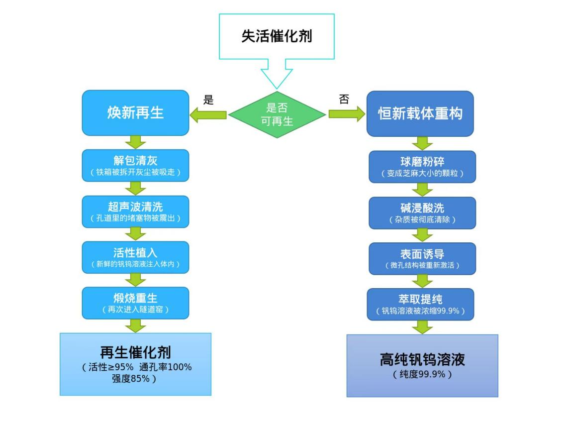 失活催化剂的运气取决于其结构完整性和活性恢复潜力。关于可再生催化剂,通过全解包分选工艺扫除内部梗塞物,可让其恢复生性;关于不可再生催化剂,通过进入载体重构产线,将钒钨钛元素提纯为纳米级粉体,实现资源闭环。